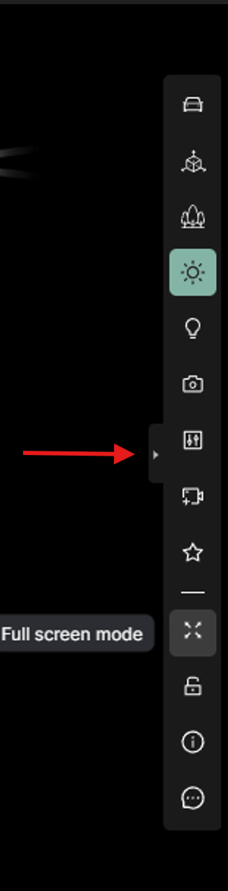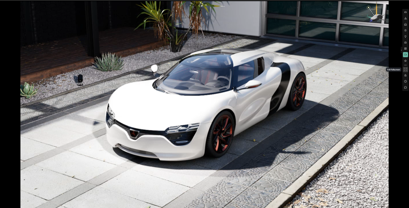Entering full screen mode will maximize the viewport to fill the available space on your display. The right hand menus and tray at the bottom of the interface will not be visible. You may also additionally reduce the amount of visual clutter by hiding the tool bar by clicking the small triangle midway down it's height. While in full screen mode the viewport will still react to user input such as orbiting, dollying and panning the camera.