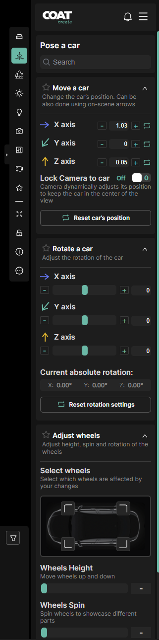 Adjust Wheels - Select the wheels icons in the diagram and then use the Wheels Height and Wheels Spin slider to affect your selected wheels.