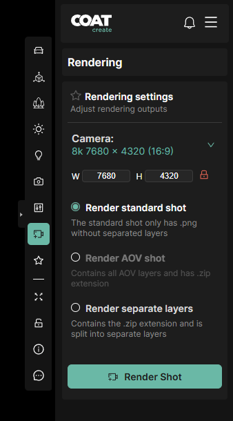 Render standard shot - The default render type. The standard shot will render only a png, similar to taking a photograph with your phone. This render type is supported up to 8k.