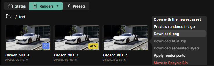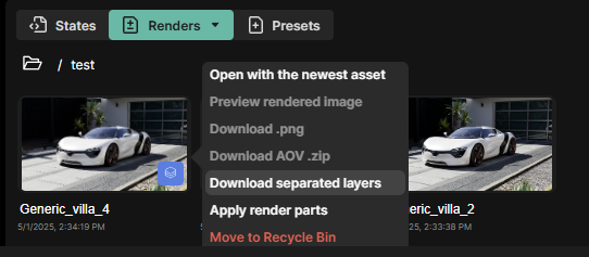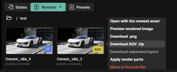 Layered renders and AOV renders are clearly labeled with a badge. If an AOV is downloaded it will be a zip file containing all the exr passes and a png.