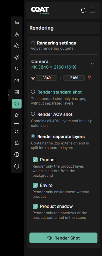- Render separate layers - This render type will generate three png outputs. One of the environment, one of product with a pre-multiplied alpha, and one of the product's shadow, also with a pre-multiplied aplha. This render type is supported up to 8k.