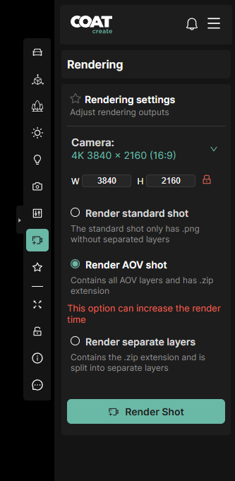 Render AOV shot - This render type will generate multiple exr files and an png file. The EXRs are Arbitrary Output Variables (AOV). Each exr is different element that can be used to recompose the final render for extended control in compositing or retouching. This render type is supported up to 4K.