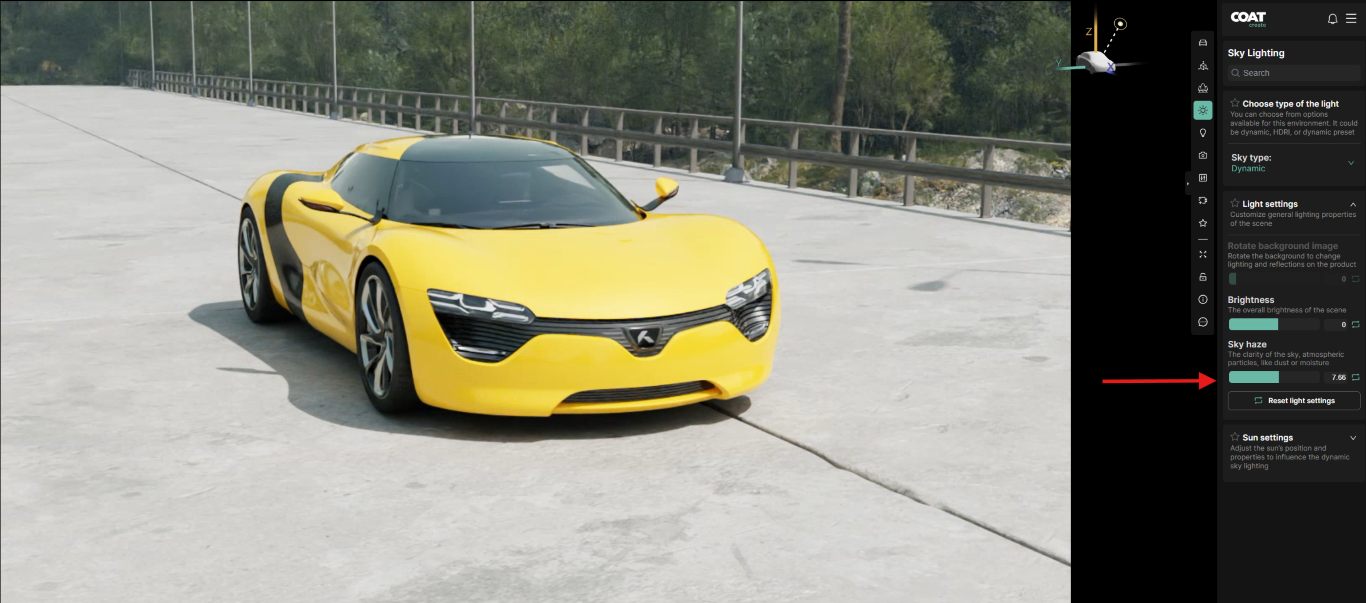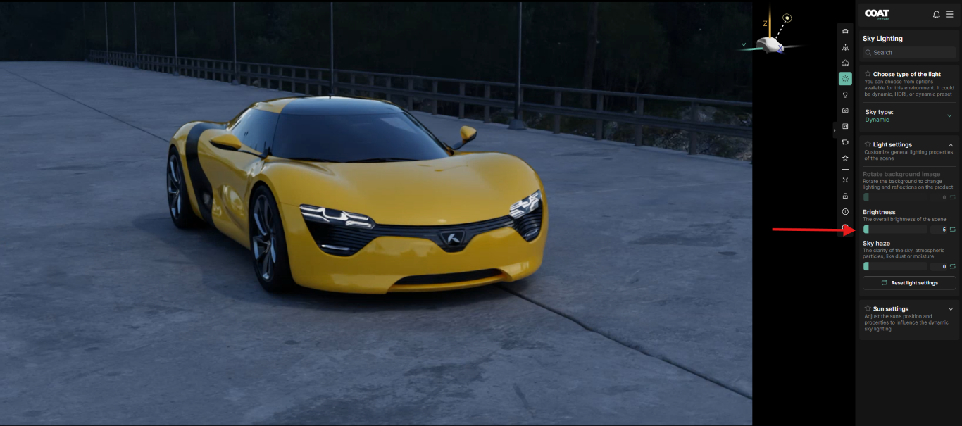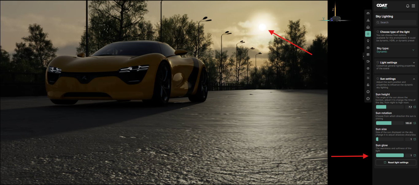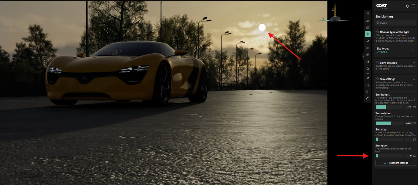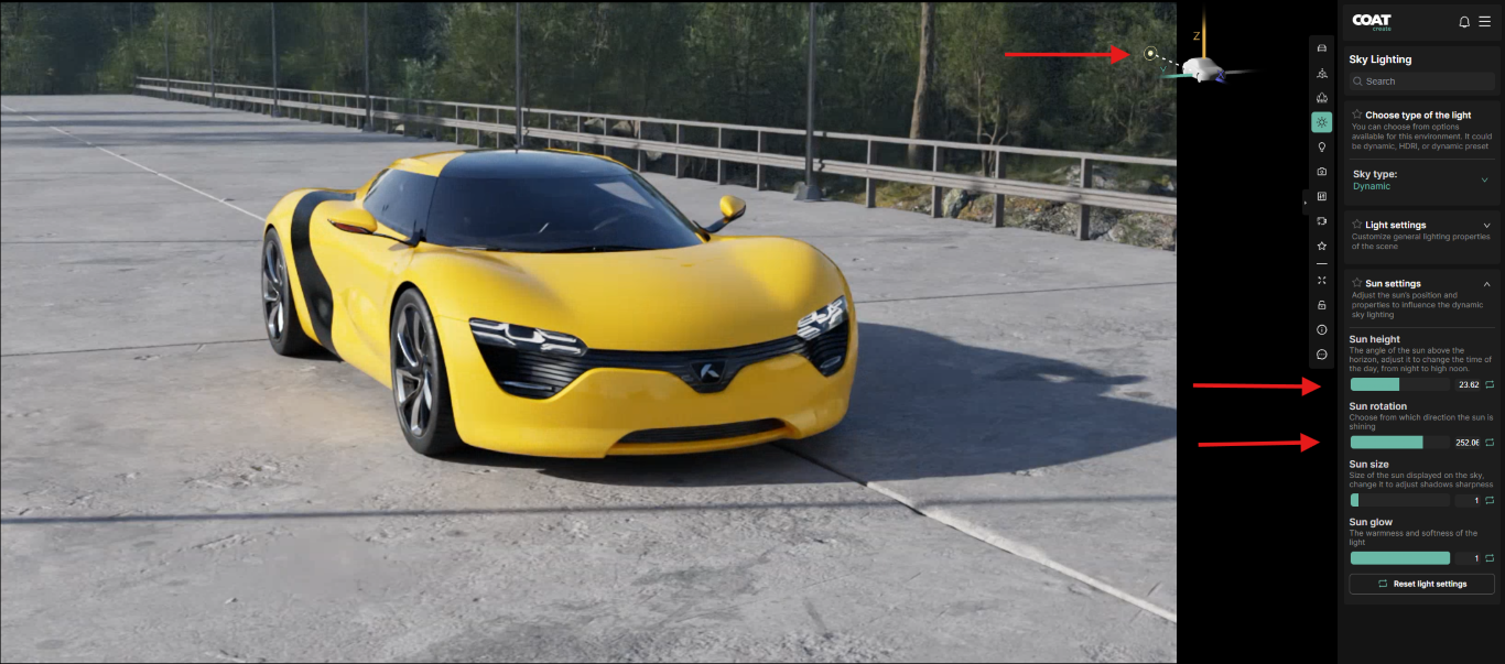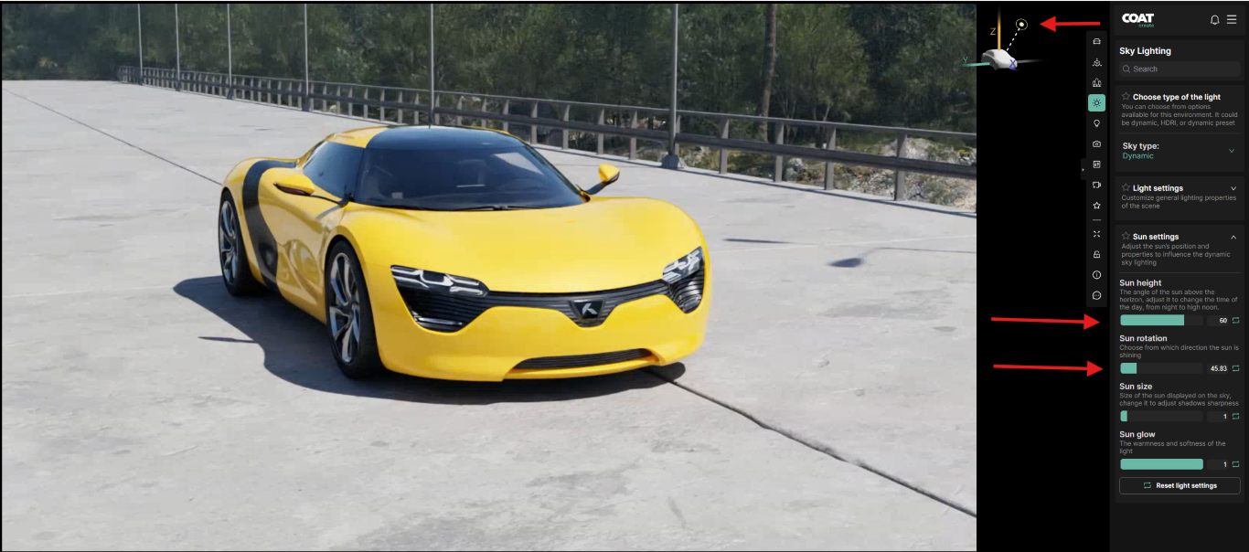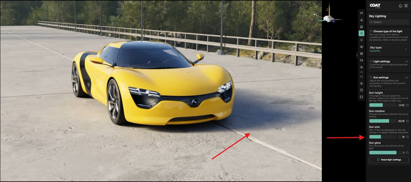 When adjusting either of these parameters the small vehicle icon at the top right of the viewport will update to display the sun's position and illumination relative to a stand in vehicle.
