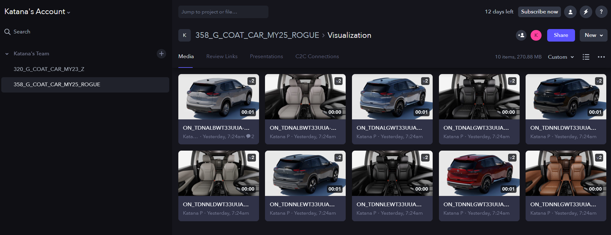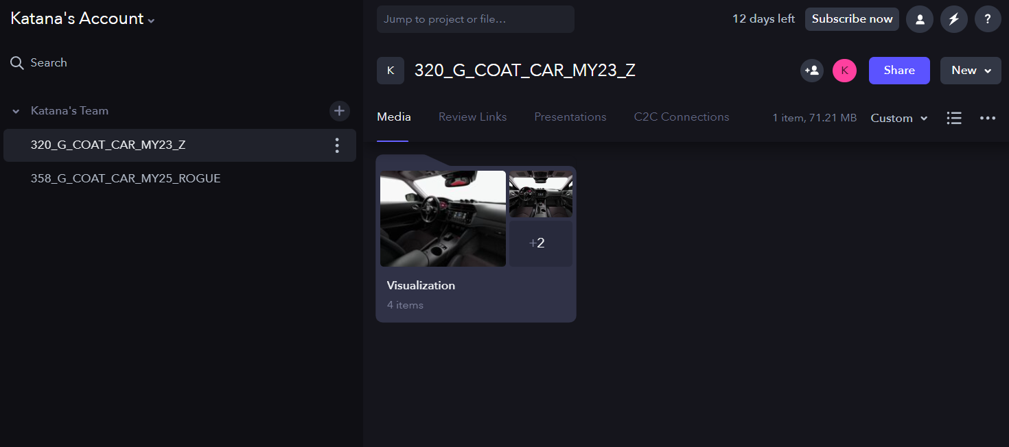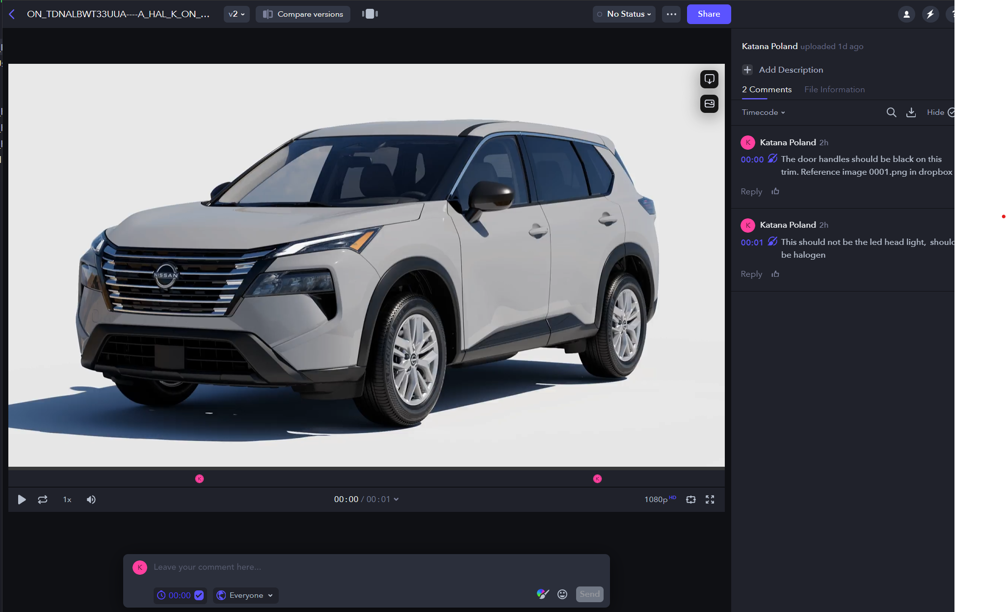 The images in frame.io are there to make commenting easier. They are not there to express any creative direction. This is why the vehicle also needs to be viewed in COATcreate as lighting, exposure and camera angle can all change and the way materials react can be evaluate